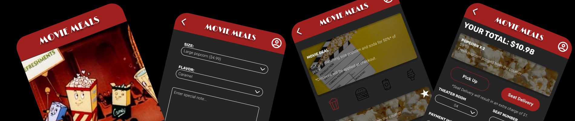 Movie Meals is a concept I designed to potentially open up concessions and meal delivery opportunities for the theater, whether at home before heading out, or from the theater seat itself.